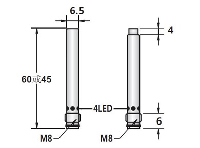 | Diameter | φ6.5*45 | | Mounting | Shielded | | Operating distance | 1.0mm | | Housing material | Nickel plated brass | | Operating voltage | 10-30VDC | | Ripple Voltage | <10% | | No-Load Current | <10mA | | Max.Load Current | 200mA | | Leakge Current | <0.01mA | | Voltage Drop | <2.0VDC | | Switching Frequency | 100HZ | | Response Time | 1.5ms/1.5ms | | Switching Hysteresis | <15% (Sr) | | Repeat Accuracy | <5.0 (Sr) | | Protection Category | IP67 | | Operating Temperature | -25℃~70℃ | | Temperature Drift | <10% (Sr) | | Short-circuit Protection | YES | | Overload Current | 220mA | | Output indicator | LED | | Output | DC 3 Wire | | Connection type | M8 Connector | | Material Active Face | POM |